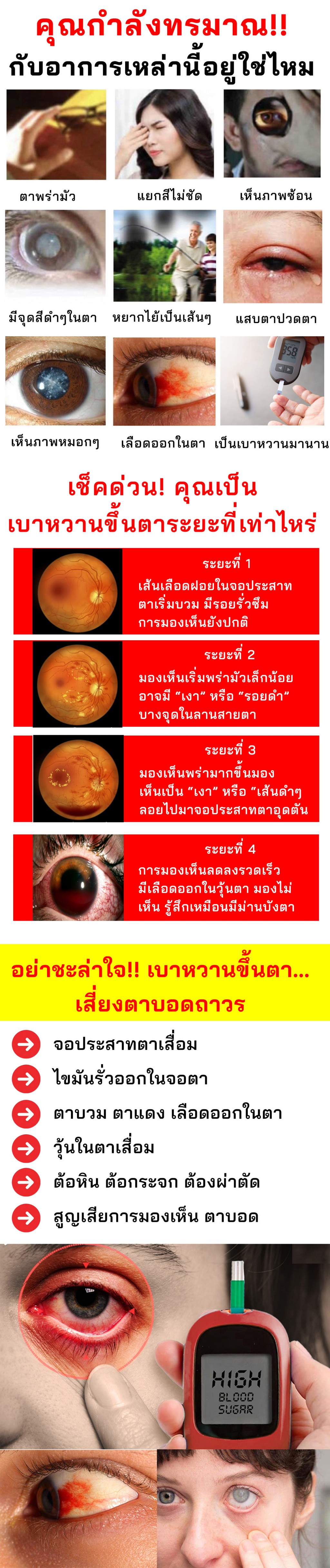 หมอแจ้งว่าเป็น "ภาวะเบาหวานขึ้นจอประสาทตา" ให้ยามากิน ควบคุมลดน้ำตาล รักษามาเรื่อยๆ แต่ไม่มีท่าทีว่าจะดีขึ้นเลย เหมือนจะแย่ลง